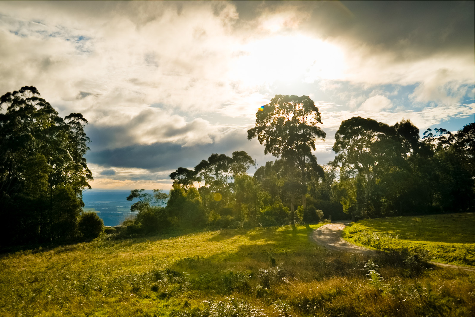 Mt. Toolebewong to their property. The first impression before even arriving to the front gate is the enchanting gum tree and fern rainforest for the first couple of kms leading to their gate. Once onto their property, it’s obvious that this isn’t a densely-packed community, but rather a private rural retreat at the top of the mountain. Despite the wilderness feel, it’s still only an hour drive to Melbourne CBD, whose city centre is clearly visible from the village. Amongst the first things we see are a giant wind turbine-slash-sculpture (we later learn that it actually was an innovative wind machine that never really worked, but when the press arrived for its launch, two people were hidden inside the base turning the sail on cue for the cameras), plus a couple of dwellings, lots of hand-carved directional signs and a heap of open space.