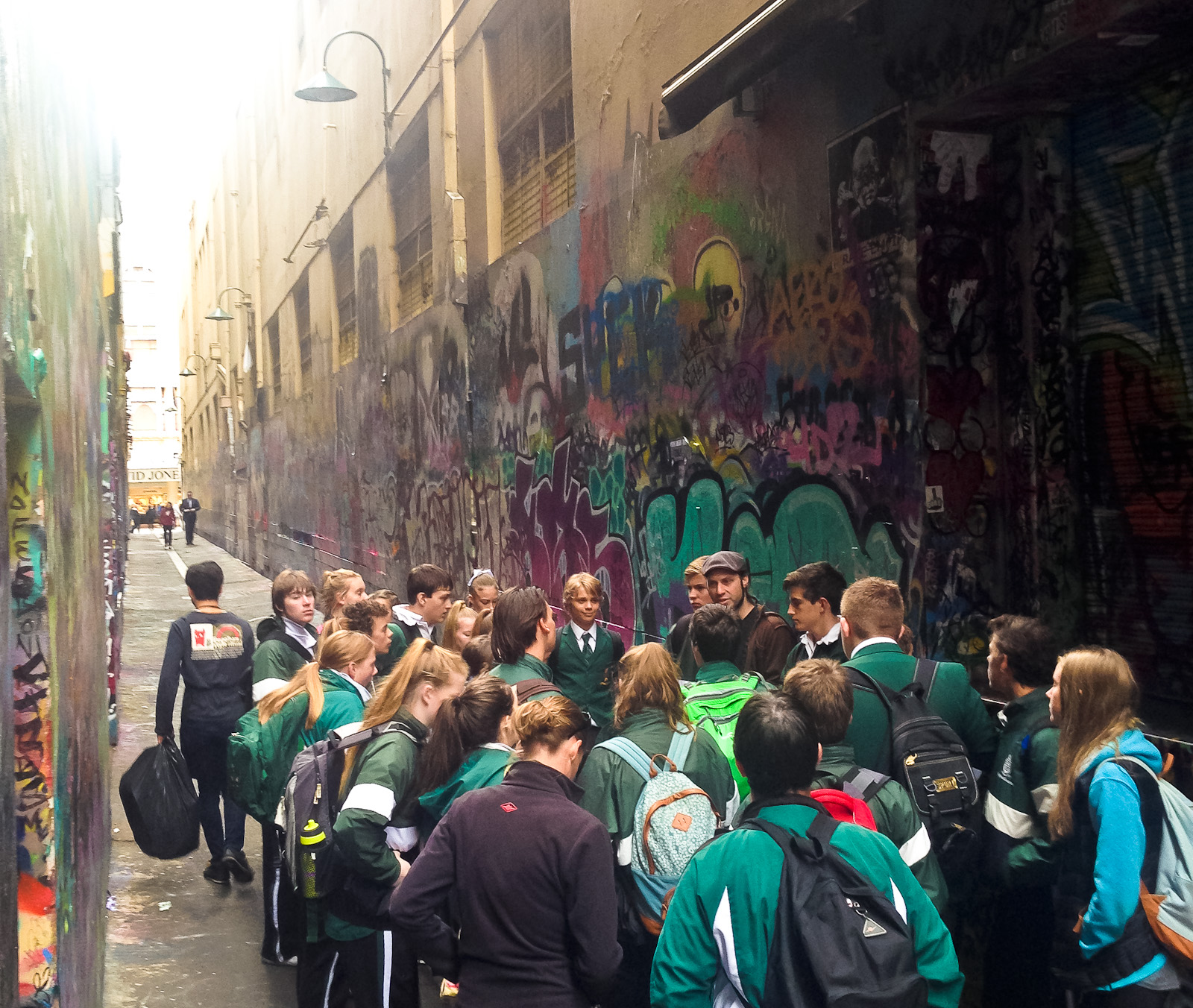 Other highlights from our short visit were: a walk around the area streets with some year 9 students, a writing class with local folks of all backgrounds and a men’s shed morning. The first was a suggestion by Stephen; he thought we’d enjoy the awareness-raising educational walk that Evan year ninesEvan – a non-resident Urban Seeder – does with year 9’s. Apparently they have a program organised with 3/4 of all Victorian schools to do these exposure tours where the kids are invited to examine their own biases and stereotypes to do with homelessness. Learning things like that only 5% of all of the 25,000 homeless in Victoria actually live on the street but those 5% are truly lacking any support system beyond what is offered by government and groups like Urban Seed. Evan was pretty savvy to the thinking of this age group, engaged them effectively and had them all listening carefully by the end of the tour.