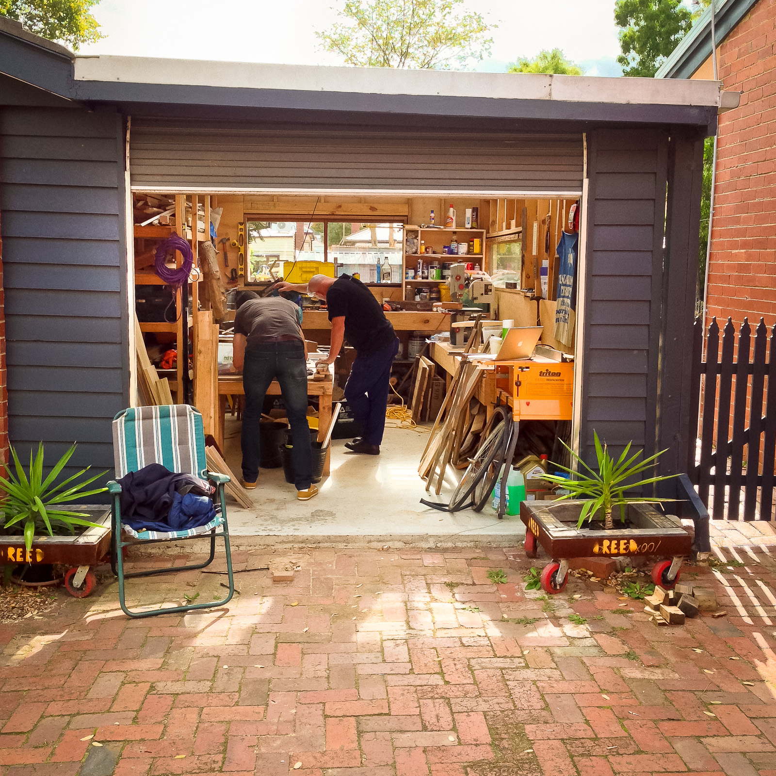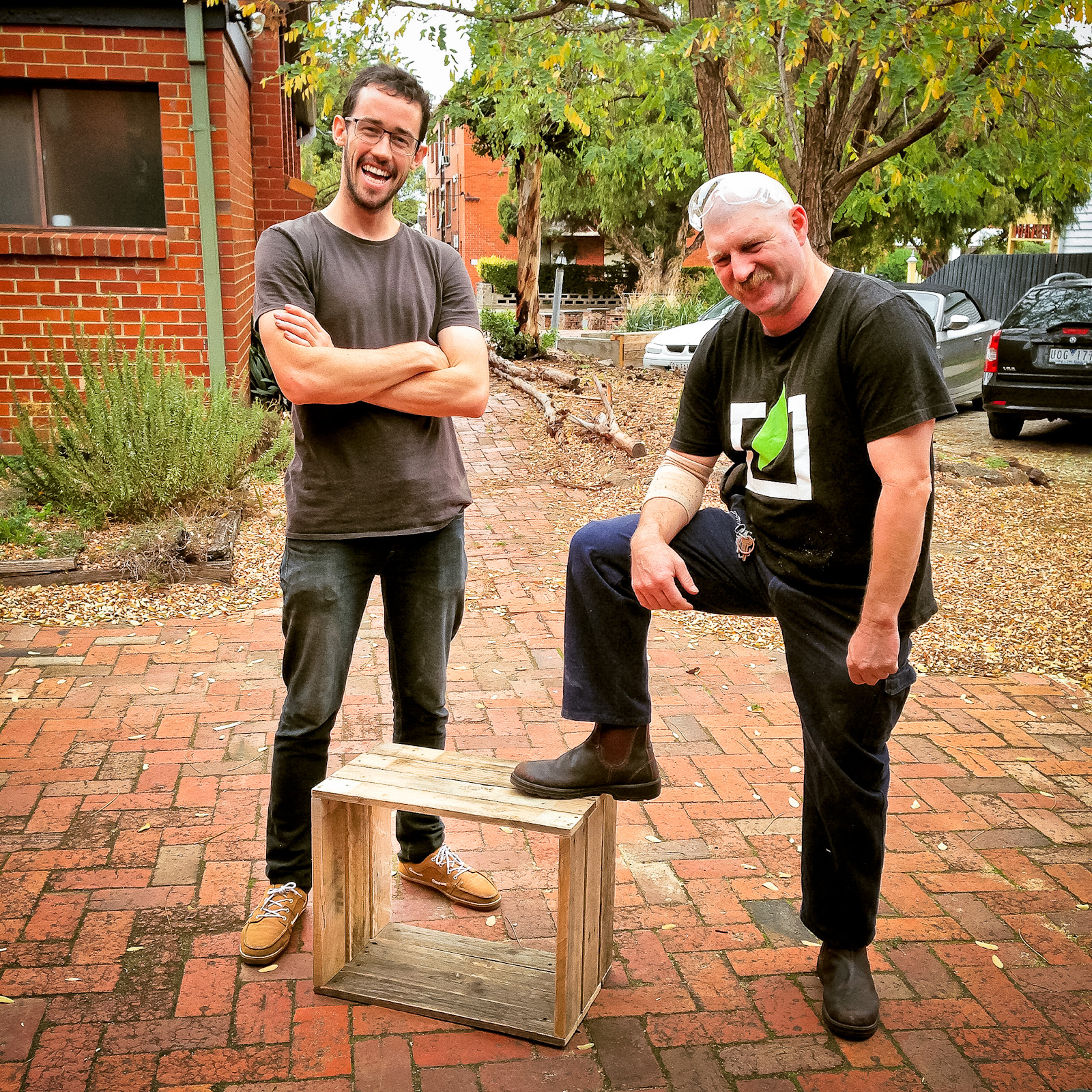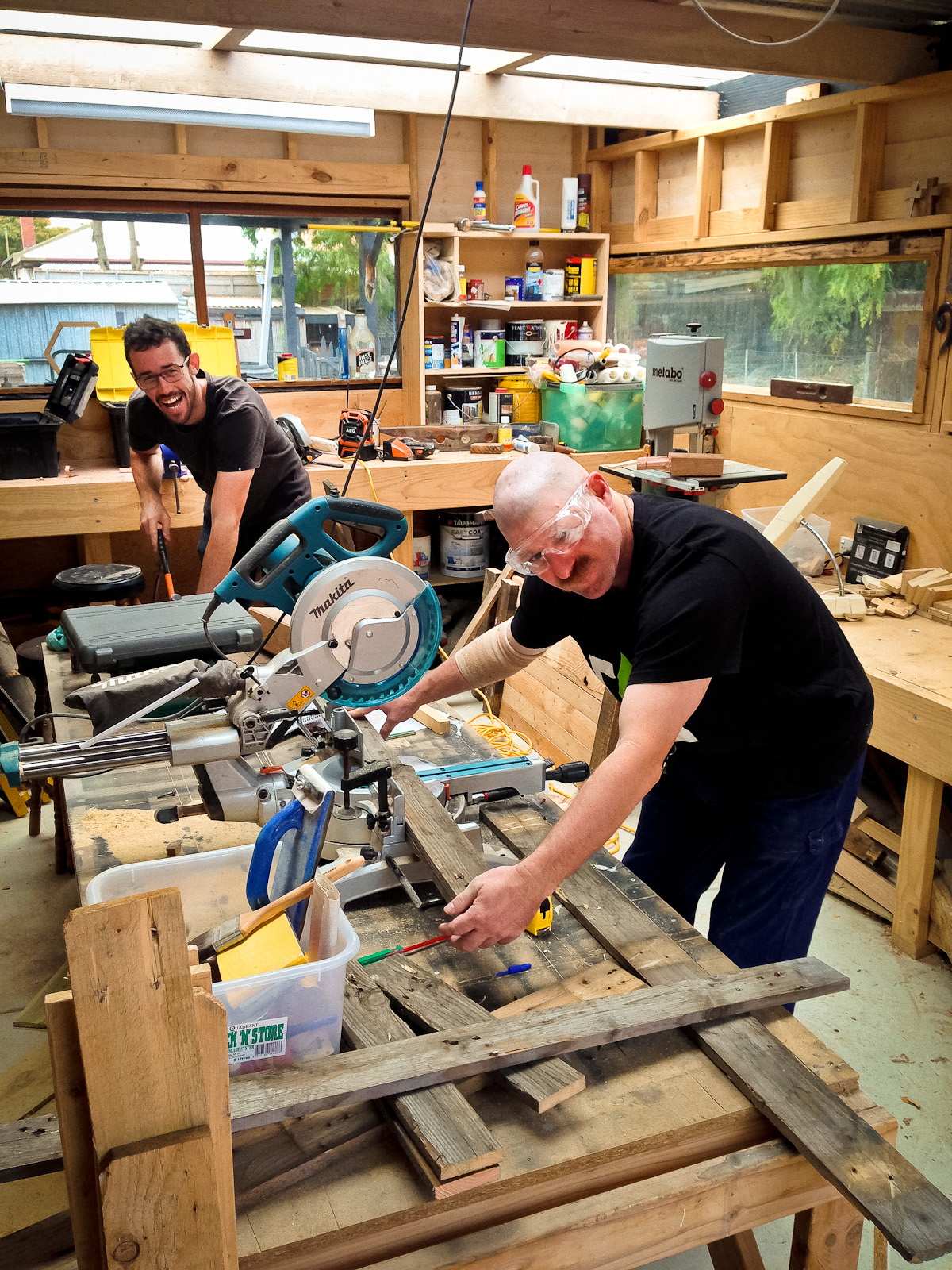 Next up was the writing class where we met with a eclectic mix of folks who had been involved in a series of artistic classes with Brigitte, the partner of Evan. She had guided the group through painting and now was writing with photography next month. I was floored by the talent of the 3 older folks as they reeled off fine pieces of literature in our 5-minute timed assignments which reminded me that there are a wealth of stories to be told from people on the streets and in the community-at-large that often never get heard. men shedOn the final morning, there was a Men’s Shed sort of activity where a suburban house and adjoining church hall had organised to have Urban Seeders come in to use a garage full of tools and timber to do wood-building projects. Jono (8th floor) and I took the train out to Ascot Vale and met Woodsy who was the only other person to come this week. There was a mix-up with wood supply which resulted in Jono and I wandering the streets in search of a wood pallet, but luckily my pallet-sniffing senses were still keen from my Holden Hill days and I found us a nice one. We promptly put together a wood crate to be used as part of a table, and were wrapped by lunch.