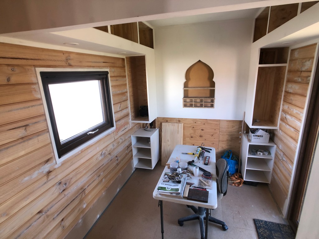 Cutting into the walls of the house was exciting to see light flood in but also to illustrate the strength of building in a semi-trailer: ease of altering the structure without having to build a framework to support it. Mike walks us through more of the house plan as we can see the vision unfolding before us. Enjoy!